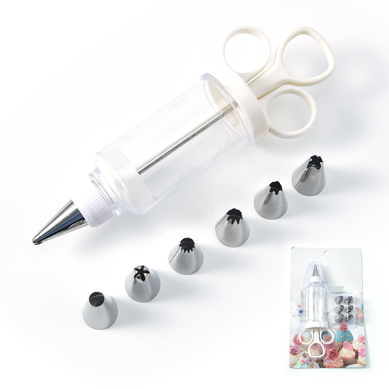 Jeringa de repostería con 7 accesorios, jeringa material plástico y boquillas de acero inoxidable.