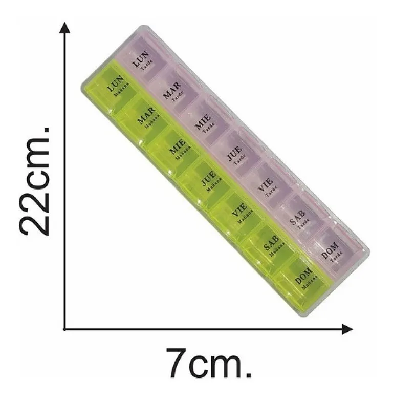 Este pastillero semanal está diseñado para facilitar la organización de su medicación con dos compartimientos por día, correspondientes a mañana y tarde. Cada compartimiento cuenta con una tapa individual para cada día de la semana, desde lunes hasta domingo, permitiendo una mejor gestión de sus tratamientos.